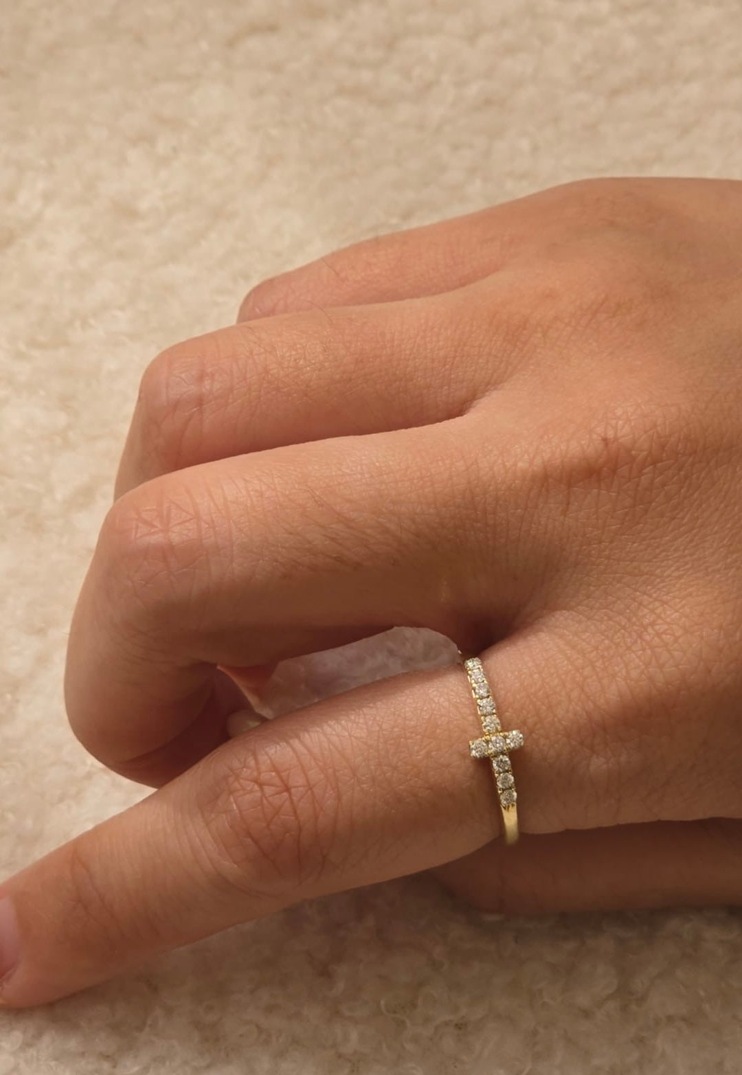 這款獨特的十字架形狀鑽石戒指,完美結合了經典與現代設計。戒指的中心是閃耀的天然鑽石,象徵著永恆與愛。其十字架的造型不僅時尚,還寓意著信仰與希望。