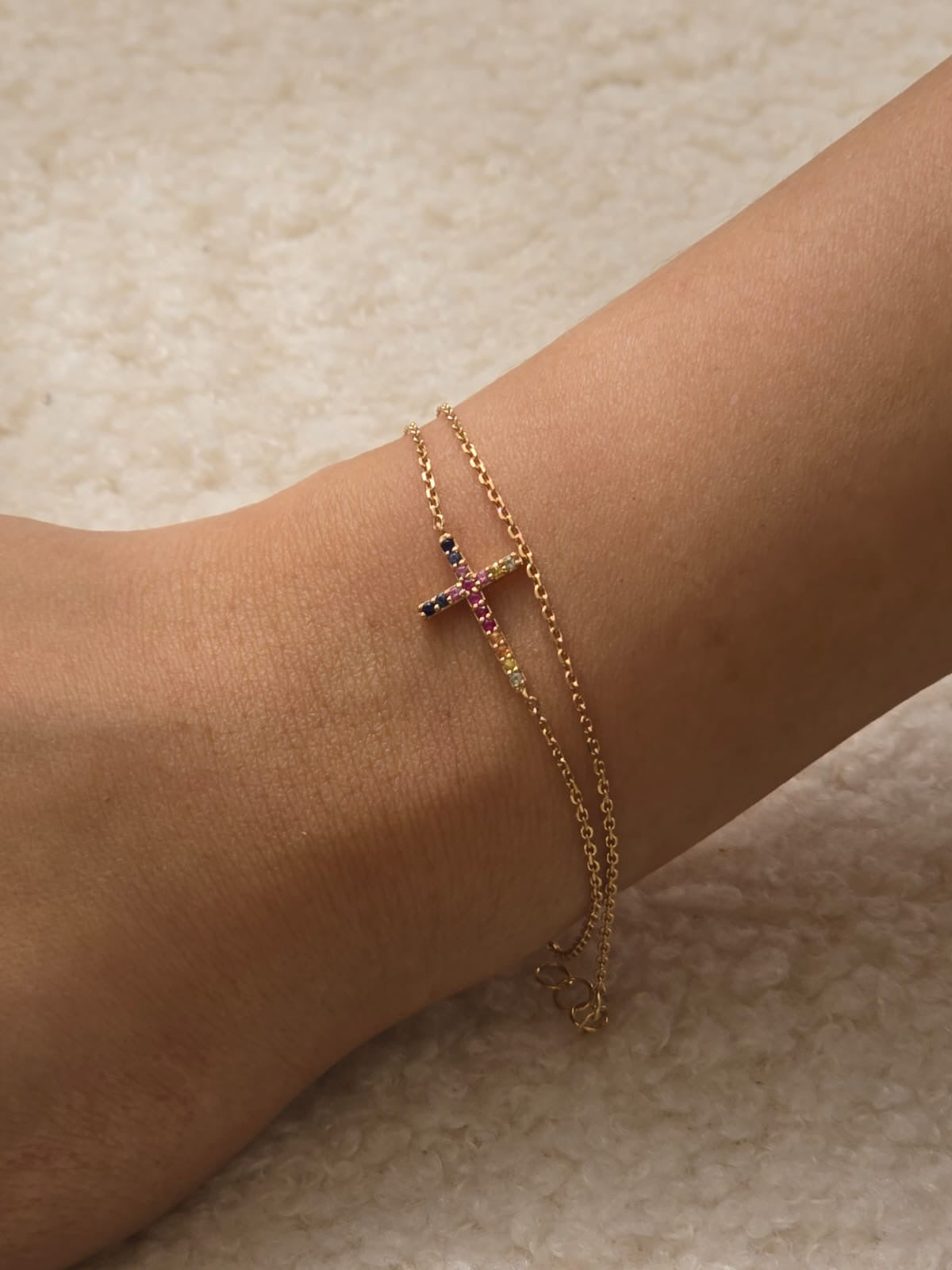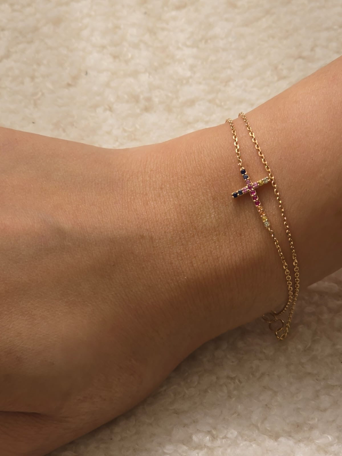 黃金彩虹寶十字架手鏈 是一件不僅具美感,更富有意義的珠寶。它以高品質的14K黃金製成,展現出奢華與耐用的特性,適合日常佩戴或特別場合。