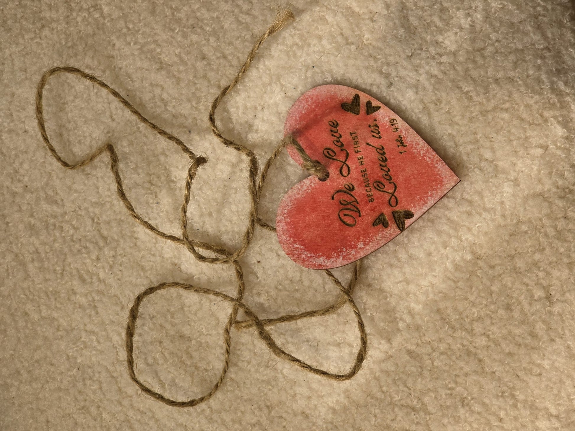 Description — The hand-painted wooden heart sign “We love because He first loved us”
